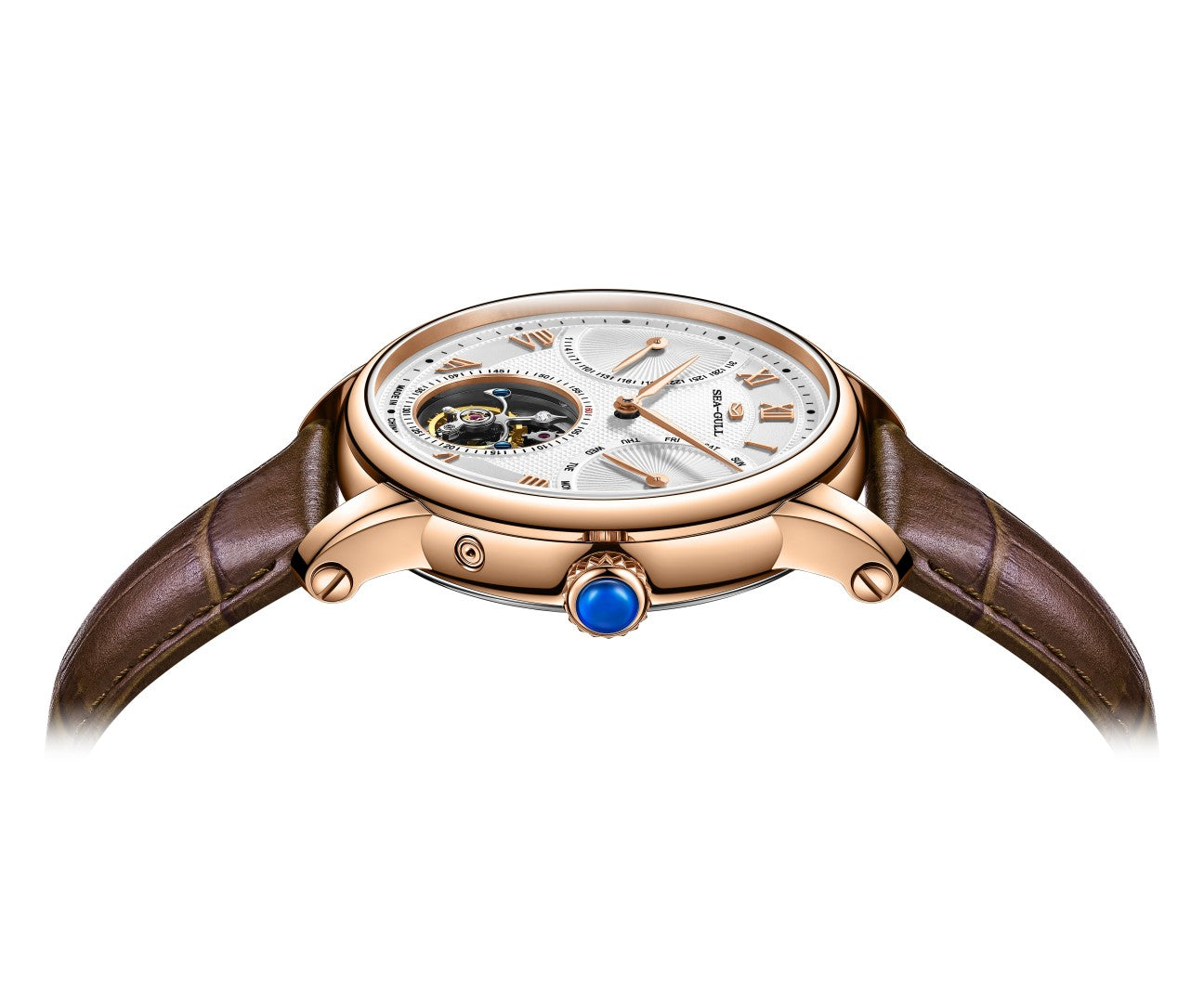 Dial Design: Constructing a miniature hall of civilization, the pristine white dial features sunburst patterns and Roman index textures that outline the play of light and shadow. The dual retrograde calendar function and tourbillon create a profound three-dimensional sense and fluid beauty on a flat surface. The classic three-dimension- al Roman indices stand as firmly as the colonnades of the Pantheon, while the steel-blue leaf-shaped hands sweep gracefully across, as if witnessing the passage of time beneath a starry sky.